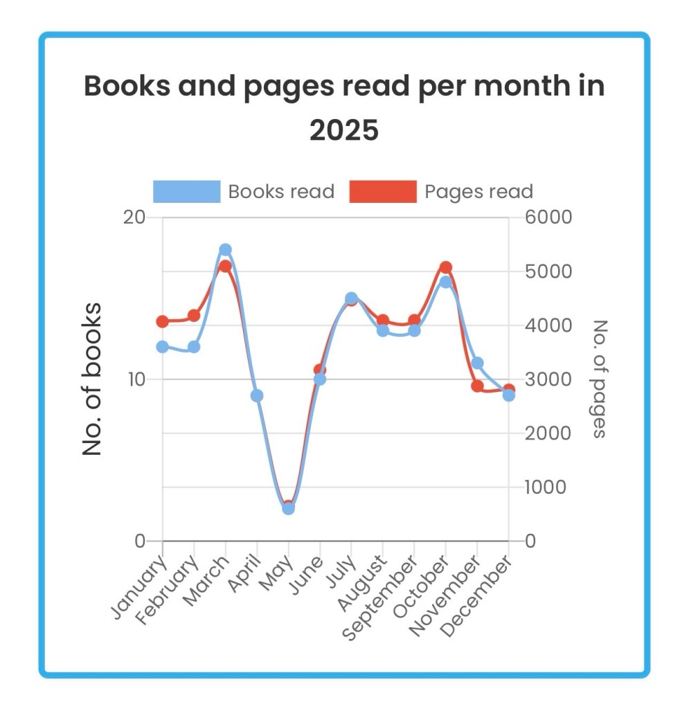 Let’s talk about my year in books. The original goal I set for 2025 was 120 books. I thought 10 a month was a reasonable goal. Well, then unemployment hit me, and I managed to read 140 books last year. I absolutely do not recommend unemployment, but it definitely helps your reading game. March was my busiest month, May was my slowest. I had Henry’s birthday party to occupy me the first half of the month, but don’t know what happened after that.