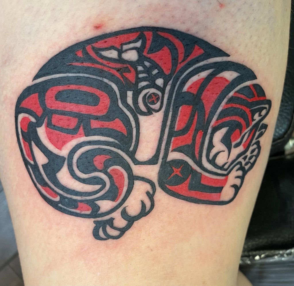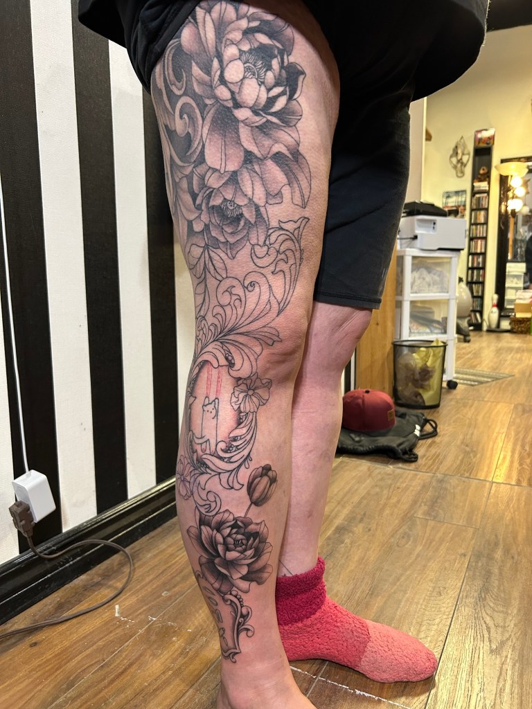 But then, I met Becky Berry. She is phenomenal! I have found my forever tattoo artist, as long as she’s doing the work. She has great energy, and she’s an amazing artist. She has done my most recent pieces – the last one was a commitment – it was supposed to be a full leg piece, but I had to prioritize Henry and his adoption over finishing the full leg. It’s still a gorgeous work of art, and I love it. I’ll get back to it someday.